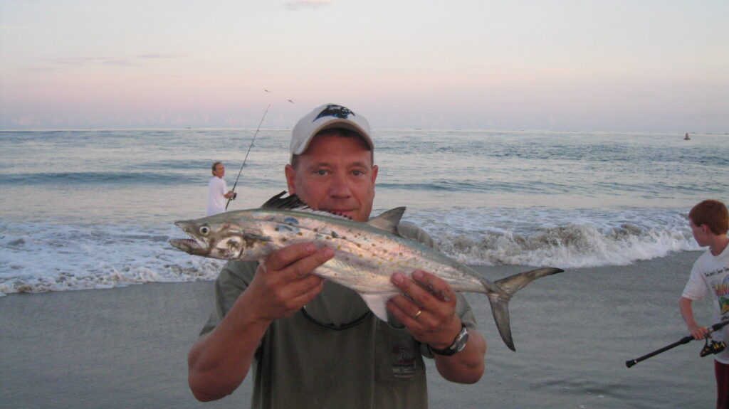 The water around Ocracoke offers many angling choices. In addition to casual surf fishing while the family is playing on the beach, there are numerous opportunities for the small boater and serious surf caster. While some of the same techniques work in either case, some specialized rigs and baits can increase your luck. Pompano are an extremely great tasting fish that are great fun on light tackle. They can be caught both on the beach and on near shore bars, as they are feeding on sand fleas. Shrimp and sand fleas are the best baits, and most fishermen use a light two hook pompano rig. Others prefer to fish for them with light egg sinkers and a Carolina rig. Either way, these fish are great fun and can be abundant in the July surf.